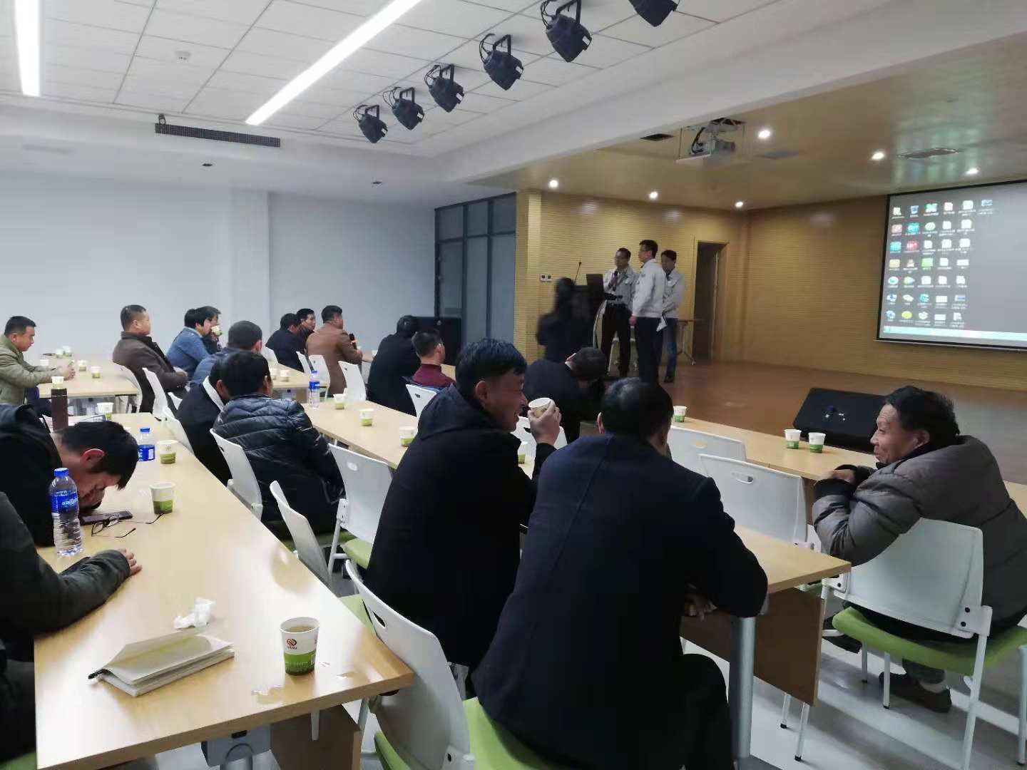 隨后一行人來(lái)到二樓多功能廳,銷(xiāo)售王經(jīng)理詳細(xì)給大家介紹了亞澳農(nóng)機(jī)的幾大系列產(chǎn)品:旋耕機(jī)、小麥花生精量播種施肥機(jī)、深松機(jī)及聯(lián)合耕整機(jī)。把這些機(jī)具的配套馬力、功能作用及產(chǎn)品特點(diǎn)都作了詳細(xì)的介紹。