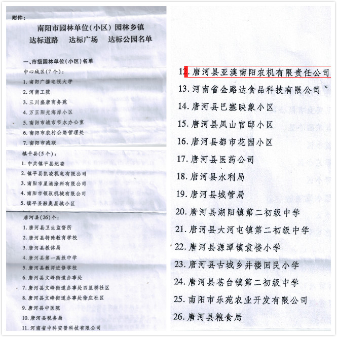近日,南陽(yáng)市公布了2018年度全市園林式居住區(qū)(單位)評(píng)選結(jié)果,亞澳南陽(yáng)農(nóng)機(jī)有限責(zé)任公司榜上有名,榮獲市級(jí)“園林式單位”榮譽(yù)稱號(hào)。