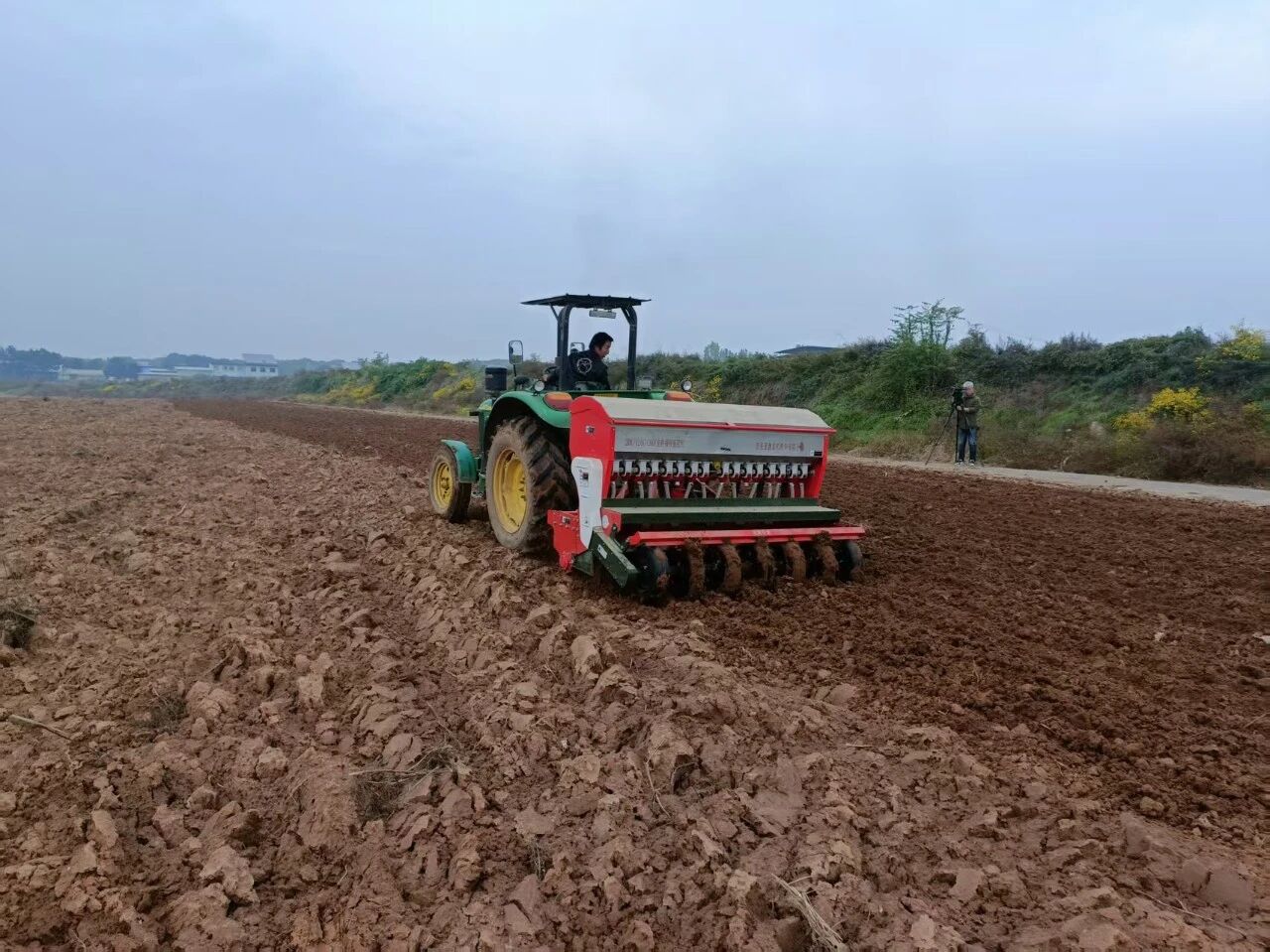 在百公里外的銅川市耀州區(qū)小丘鎮(zhèn)中原村,亞澳農機同樣成為搶種主力。“播種期推遲了近十天,土壤又濕,最怕播深不均和倒伏。”農機手操控著亞澳寬幅溝播機穿梭田間,機具搭載的指夾式排種器實現(xiàn)精準下種,配合可調節(jié)播深系統(tǒng),將播種深度嚴格控制在2—4cm的最佳范圍,既滿足銅川市農機推廣站副站長姚關盈提出的“淺播搶積溫”要求,又通過均勻播種避免了“播量過大易倒伏”的風險。截至目前,銅川市已調度1600余臺套農機投入秋播,亞澳機具憑借“旋耕、播種、施肥一體化”優(yōu)勢,大幅提升了濕墑地塊的作業(yè)效率,助力農戶把延誤的農時搶回來。