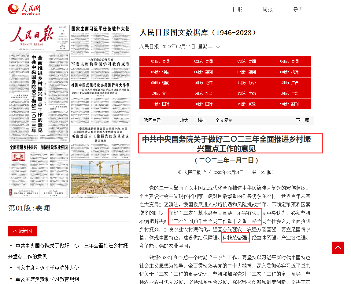 2023年中央一號(hào)文件2月13日正式發(fā)布。文件提出,要立足國情農(nóng)情,體現(xiàn)中國特色,建設(shè)供給保障強(qiáng)、科技裝備強(qiáng)、經(jīng)營體系強(qiáng)、產(chǎn)業(yè)韌性強(qiáng)、競(jìng)爭(zhēng)能力強(qiáng)的農(nóng)業(yè)強(qiáng)國。